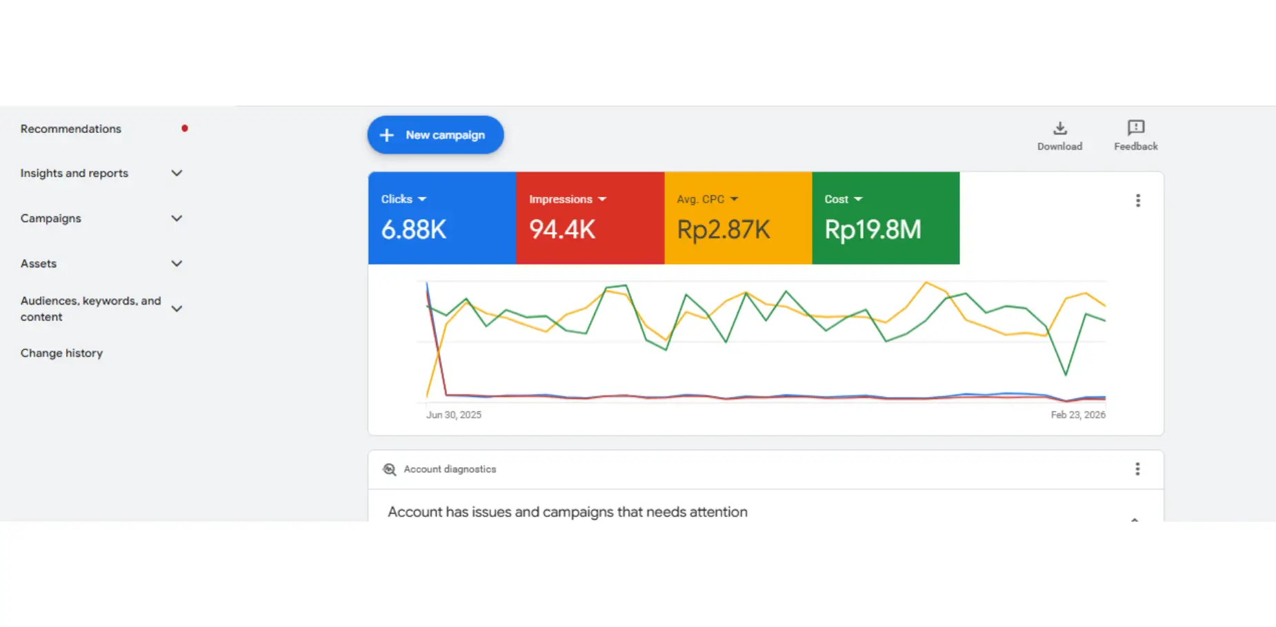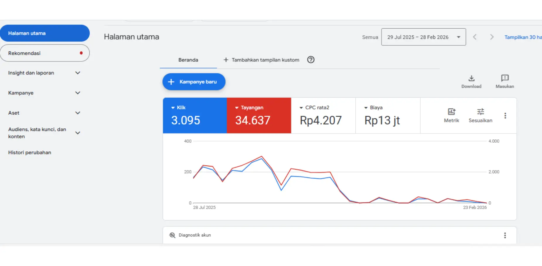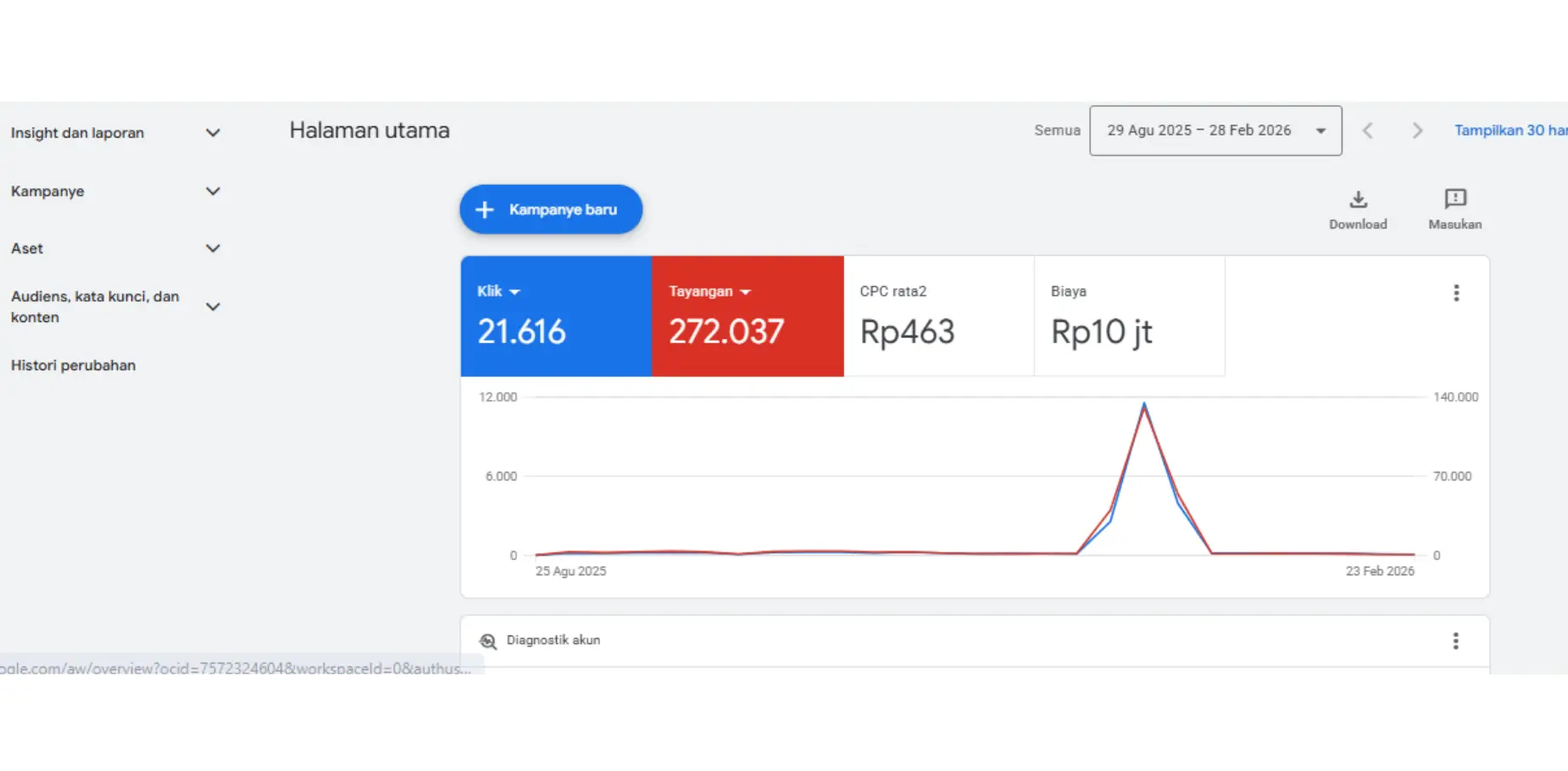 Performa campaign menunjukkan hasil yang sangat optimal. Dengan lebih dari 21.000 klik dan biaya per klik yang sangat rendah, campaign ini berhasil menarik trafik besar dengan biaya yang efisien. Peningkatan tajam pada grafik menunjukkan momentum pencarian tinggi yang berhasil dimanfaatkan untuk meningkatkan konversi.